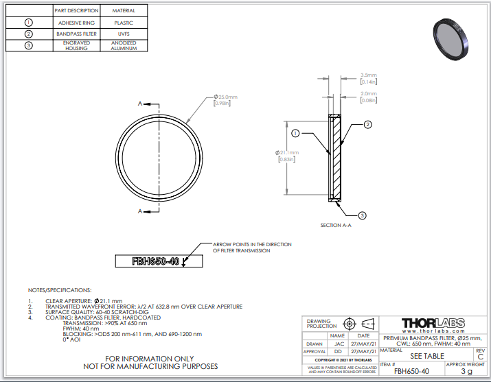 Thorlabs索雷博 FBH650-40 硬膜带通滤光片