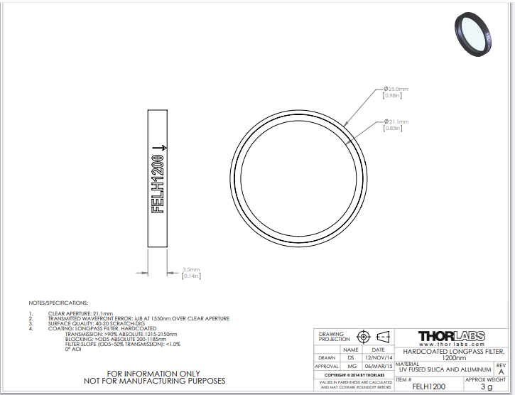 Thorlabs索雷博 FELH1200 Ø25.0 mm长波通滤光片