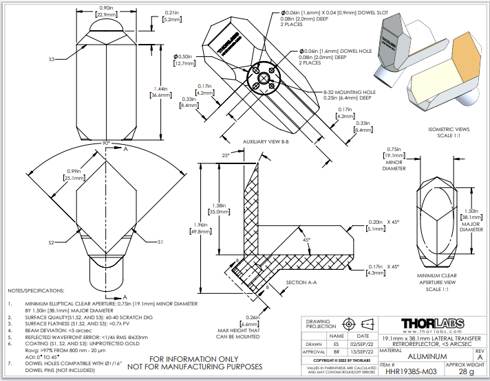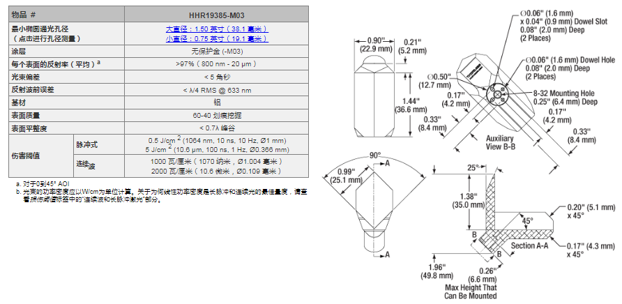 Thorlabs索雷博 HHR19385-M03 复型工艺的铝质横向位移回射器