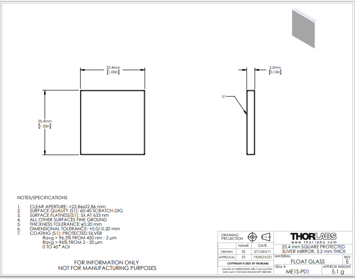 Thorlabs索雷博 ME1S-P01 方形平面反射镜