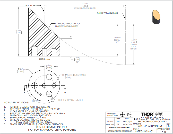 Thorlabs索雷博 MPD01M9-M01 Ø1/2英寸90°离轴抛物面镜