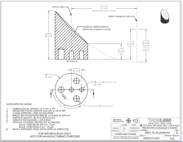 Thorlabs索雷博 MPD019-G01 Ø1/2英寸90°离轴抛物面镜