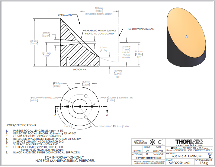 Thorlabs索雷博 MPD229H-M01 90°离轴抛物面反射镜