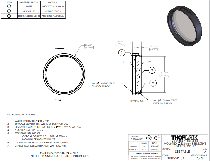 Thorlabs索雷博 NDUV2R15A 反射型中性密度滤光片