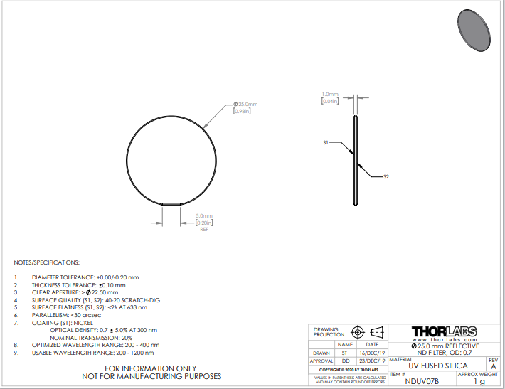 THORLABS 索雷博 NDUV07B 中性密度滤光片