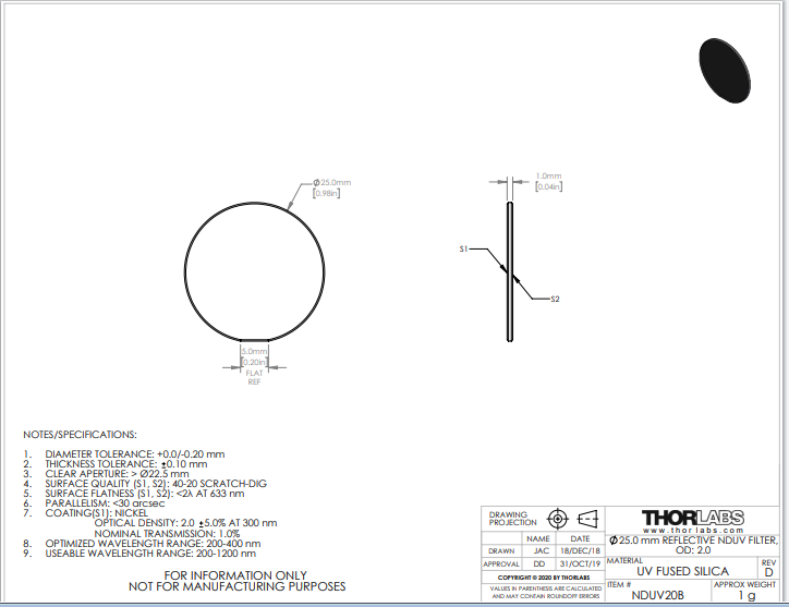 THORLABS 索雷博 NDUV20B 中性密度滤光片