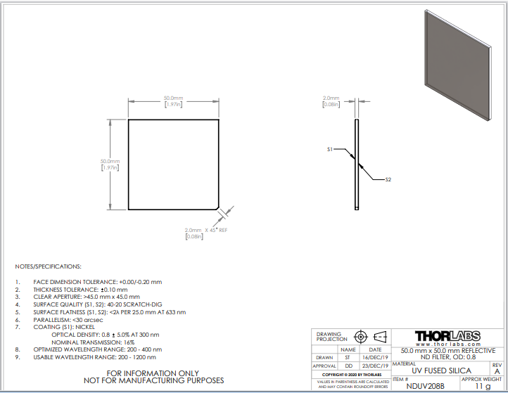 THORLABS 索雷博 NDUV208B 中性密度滤光片
