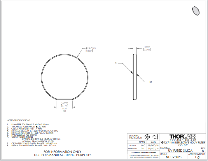 THORLABS 索雷博 NDUV502B 中性密度滤光片
