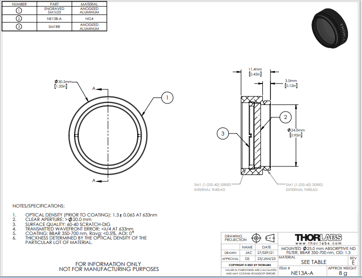 Thorlabs索雷博 NE13A-A Ø25 mm镀增透膜的吸收型中性密度滤光片