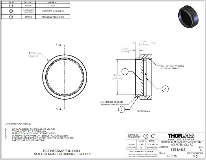 THORLABS 索雷博 NE70A 吸收型中性密度滤光片