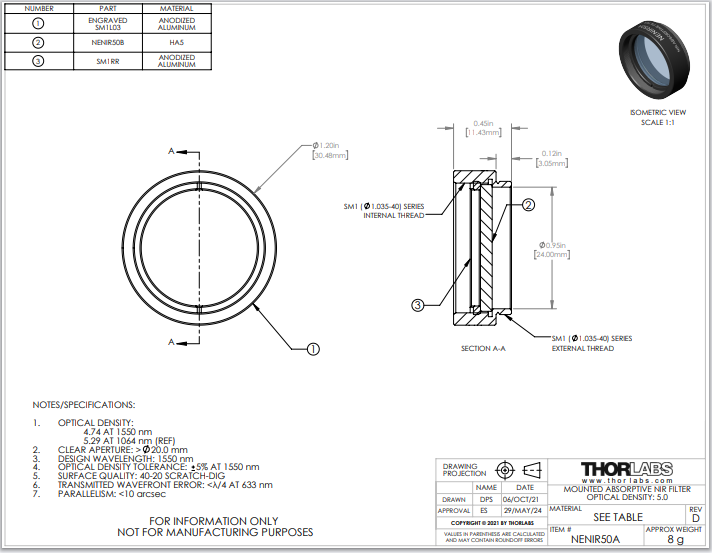 Thorlabs索雷博 NENIR50A Ø25 mm NIR吸收型中性密度滤光片