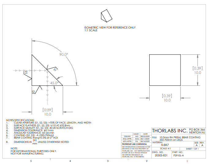 Thorlabs索雷博 PS910L-A N-BK7直角棱镜