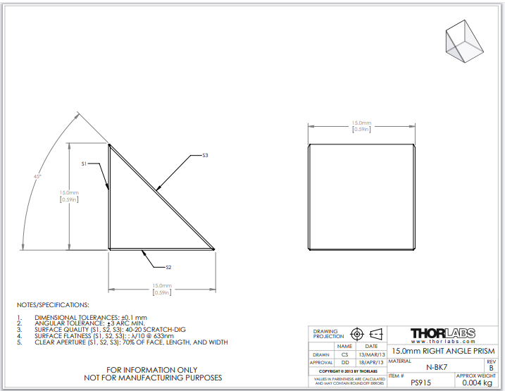 THORLABS 索雷博 PS915 N-BK7直角棱镜