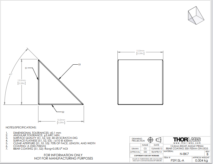 Thorlabs索雷博 PS915L-A N-BK7直角棱镜