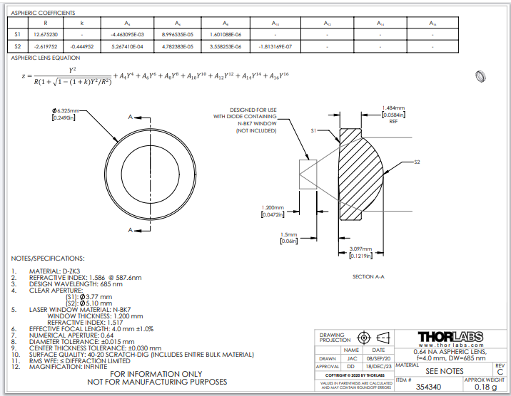 THORLABS 索雷博 354340 非球面透镜