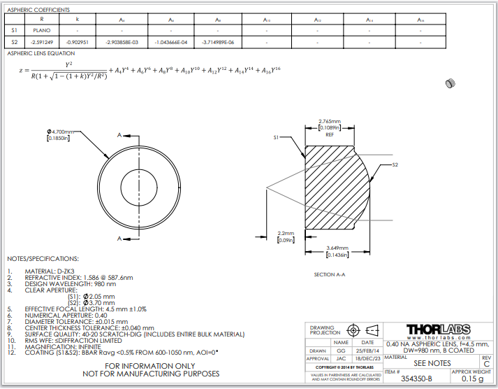 THORLABS 索雷博 354350-B 非球面透镜