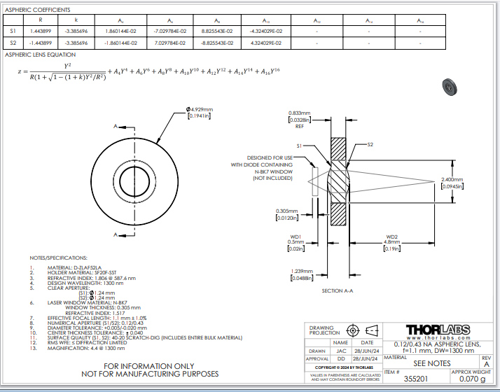 THORLABS 索雷博 355201 非球面透镜