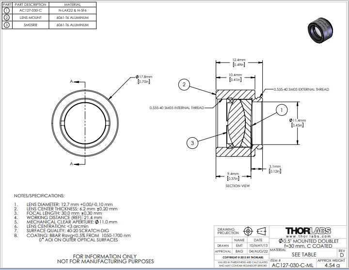 Thorlabs索雷博 AC127-030-C-ML 消色差双胶合透镜