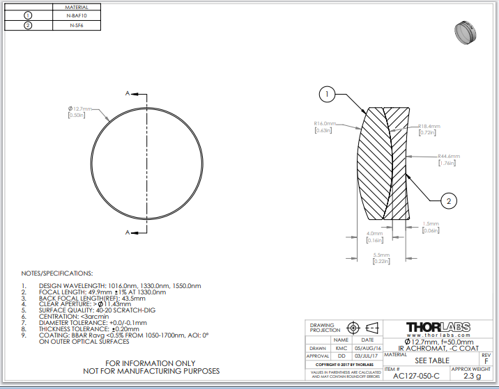 Thorlabs索雷博 AC127-050-C 消色差双胶合透镜