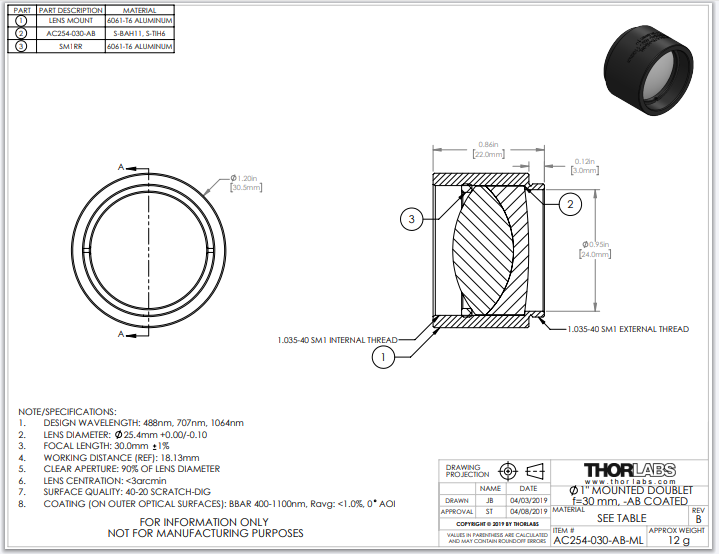 Thorlabs索雷博 AC254-030-AB-ML 消色差双胶合透镜