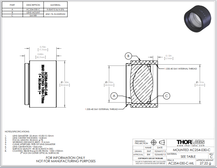 Thorlabs索雷博 AC254-030-C-ML 消色差双胶合透镜