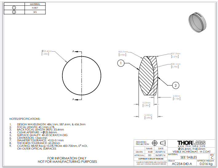 Thorlabs索雷博 AC254-040-A 消色差双胶合透镜