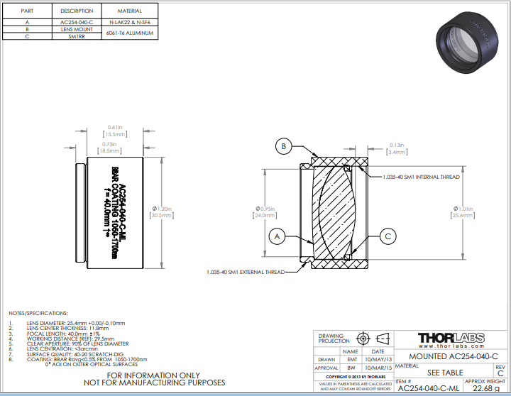 Thorlabs索雷博 AC254-040-C-ML 消色差双胶合透镜