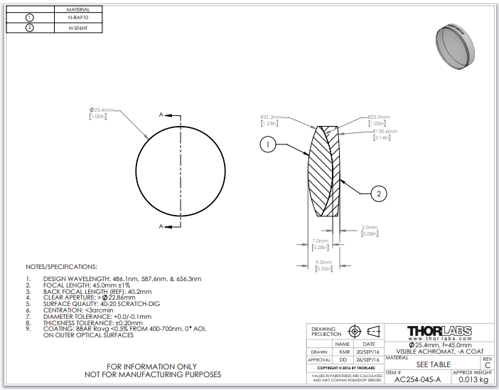Thorlabs索雷博 AC254-045-A 消色差双胶合透镜