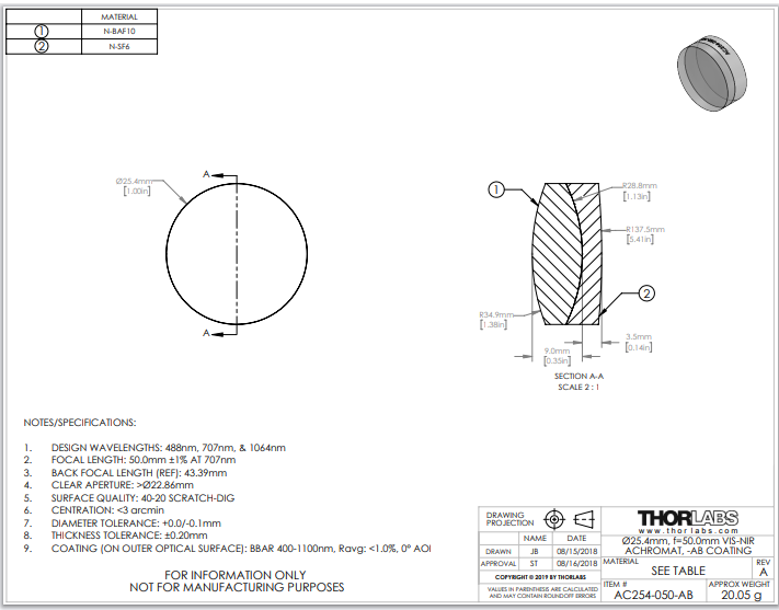 Thorlabs索雷博 AC254-050-AB 消色差双胶合透镜