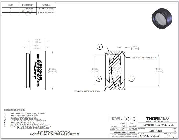 Thorlabs索雷博 AC254-050-B-ML 消色差双胶合透镜