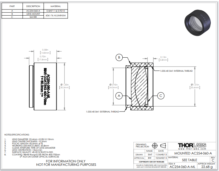Thorlabs索雷博 AC254-060-A-ML 消色差双胶合透镜