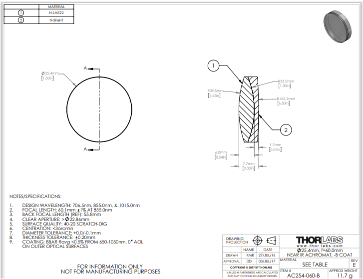 Thorlabs索雷博 AC254-060-B 消色差双胶合透镜
