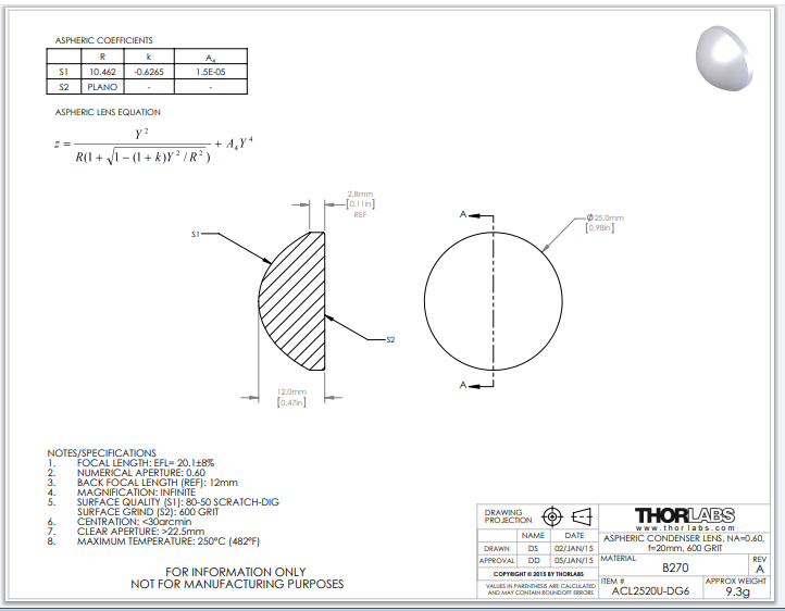 Thorlabs索雷博 ACL2520U-DG6 非球面聚光透镜