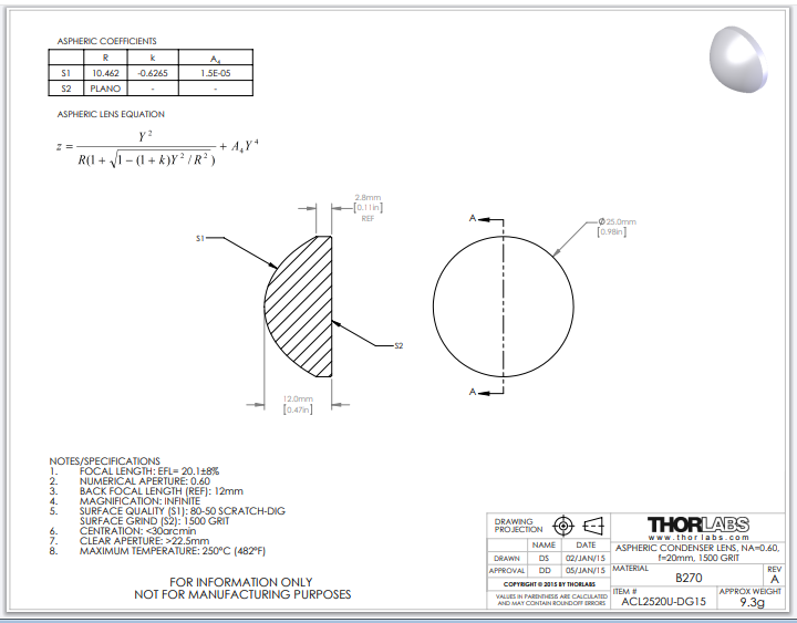 Thorlabs索雷博 ACL2520U-DG15 非球面聚光透镜