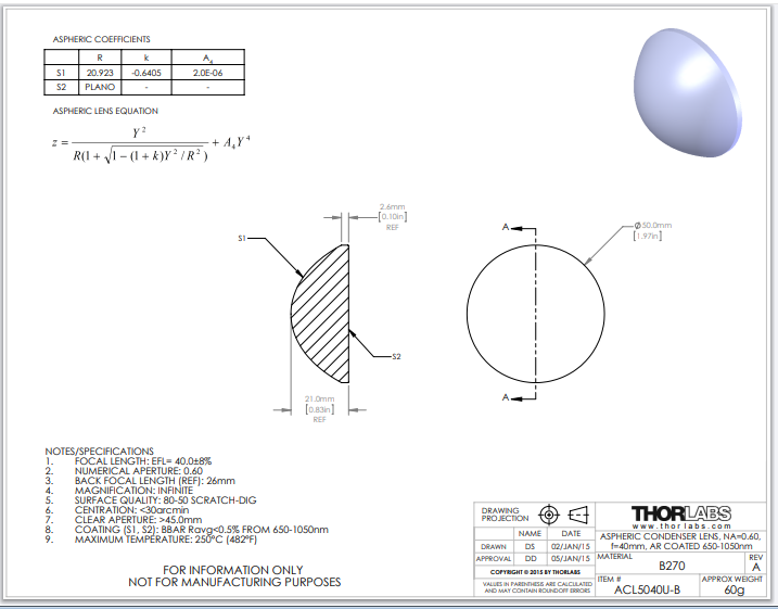 Thorlabs索雷博 ACL5040U-B 非球面聚光透镜