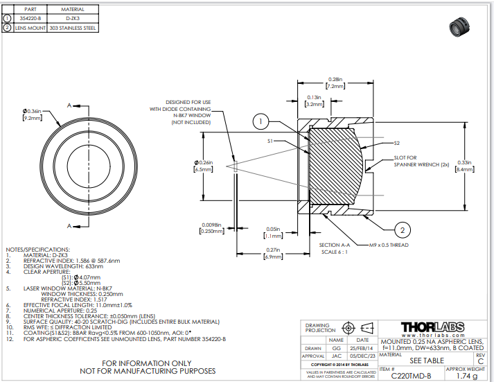 THORLABS 索雷博 C220TMD-B 非球面透镜
