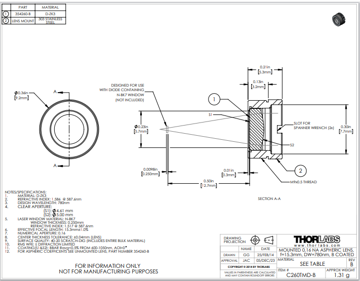 THORLABS 索雷博 C260TMD-B 非球面透镜