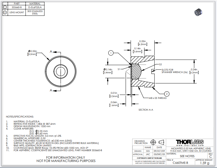 THORLABS 索雷博 C660TME-B 非球面透镜