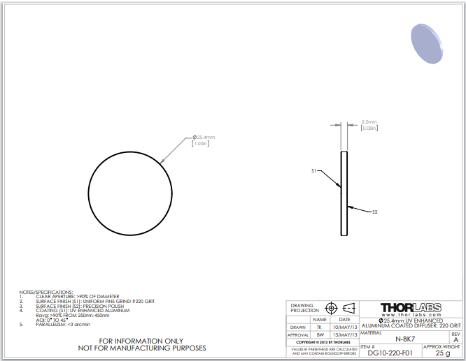 Thorlabs索雷博 DG10-220-F01 - Ø1英寸紫外增强铝膜玻璃漫反射镜