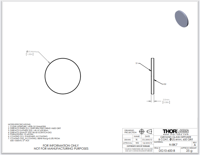 Thorlabs索雷博 DG10-600-B - Ø1英寸N-BK7磨砂玻璃散射片