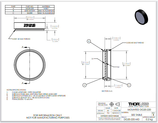 Thorlabs索雷博 DG20-220-MD - SM2螺纹安装,N-BK7磨砂玻璃散射片