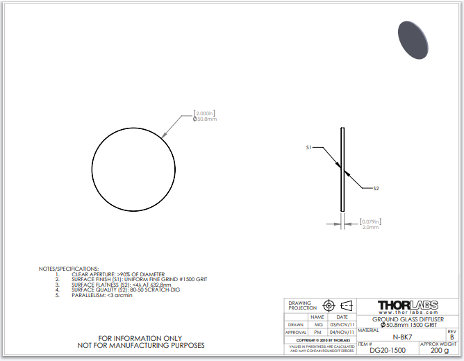 Thorlabs索雷博 DG20-1500 - N-BK7磨砂玻璃散射片