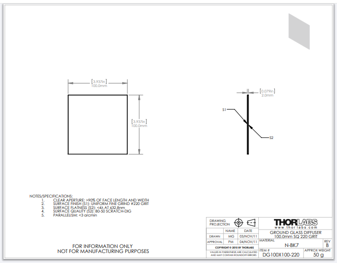 Thorlabs索雷博 DG100X100-220 - N-BK7磨砂玻璃散射片