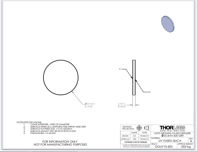 Thorlabs索雷博 DGUV10-600 - Ø1英寸紫外熔融石英磨砂玻璃散射片