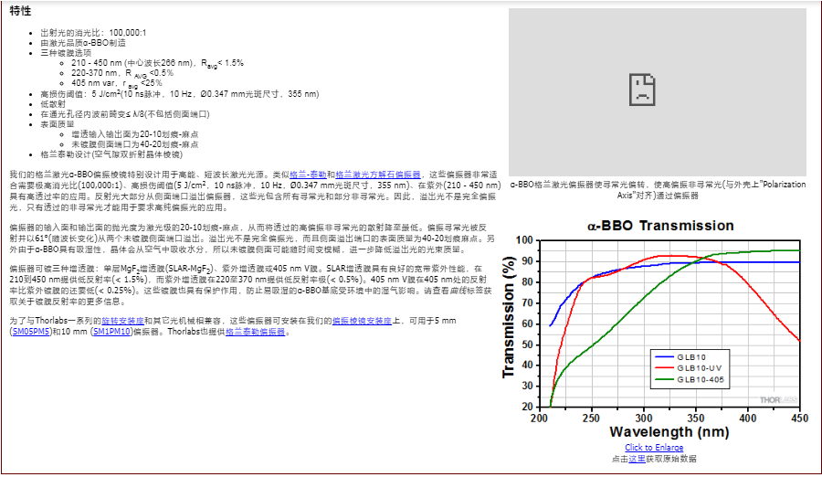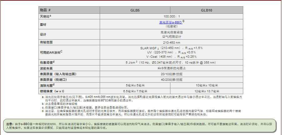 Thorlabs索雷博 GLB5-405 - 格兰激光α-BBO偏振棱镜