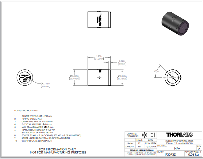 Thorlabs索雷博 I730P3D - 自由空间隔离器