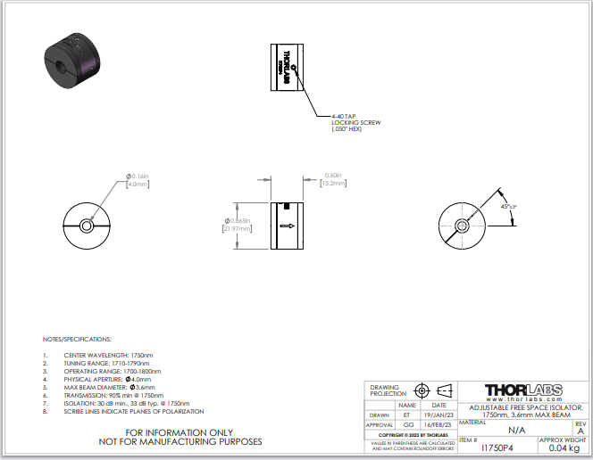 Thorlabs索雷博 I1750P4 - 自由空间隔离器