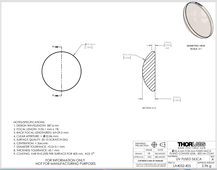 Thorlabs索雷博 LA4052-405 平凸透镜