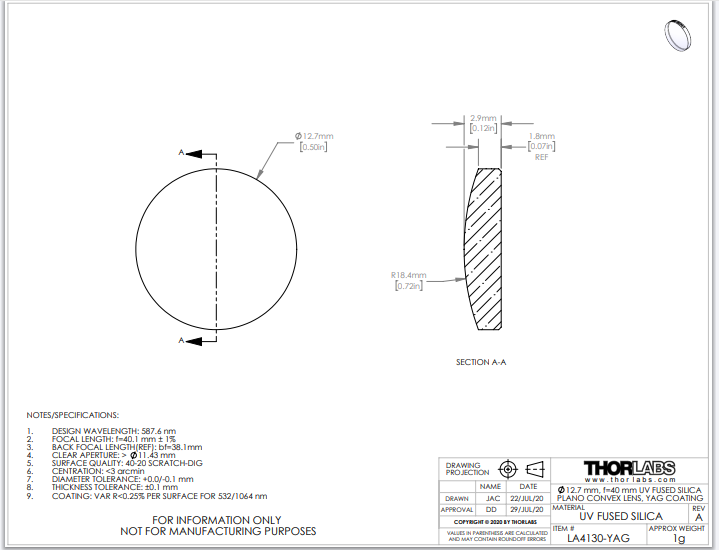 Thorlabs索雷博 LA4130-YAG 平凸透镜