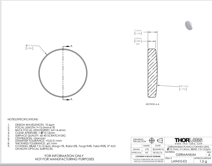 Thorlabs索雷博 LA9410-E3 平凸透镜
